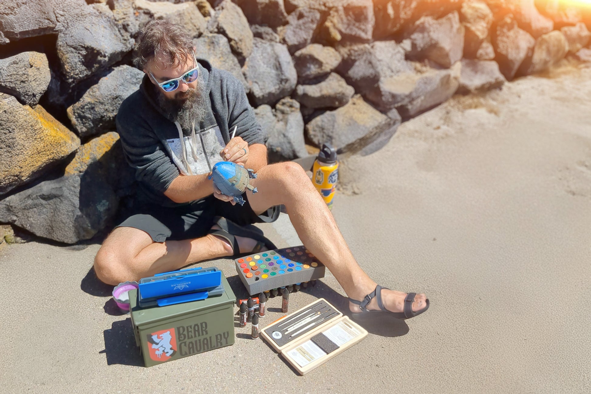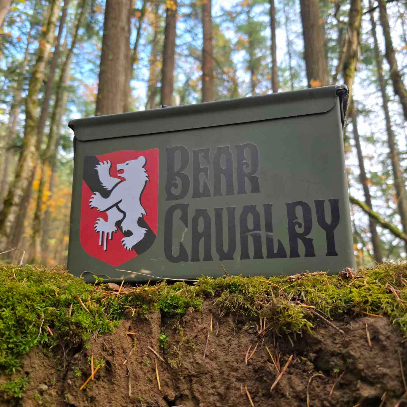 Custom metal ammo box with Bear Cavalry logos, and 50 of our sustainably manufactured, water-based acrylic paints! 48 colors plus a glaze medium and streaking grime.